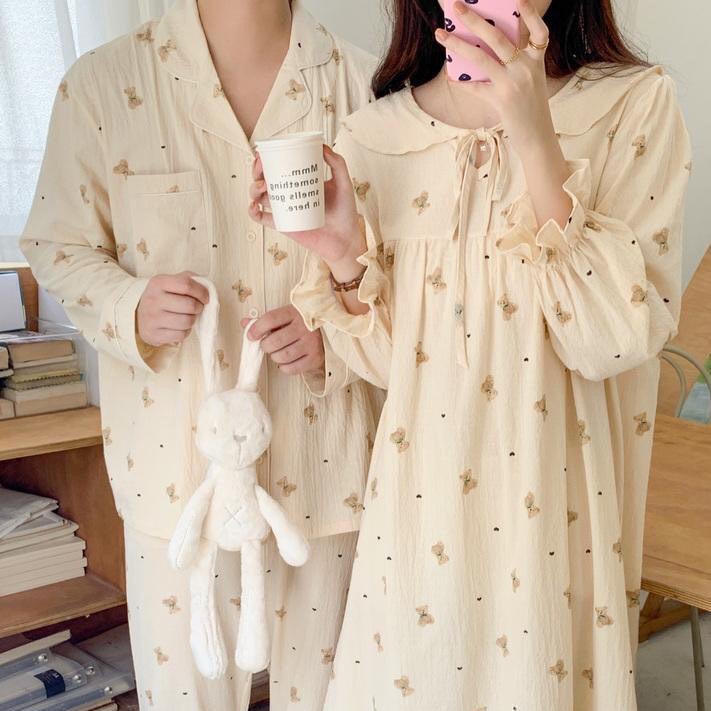 [남녀] (러스베어세트) 원피스커플잠옷 가을 긴팔 빅사이즈 파자마 홈웨어 면 남자 여자