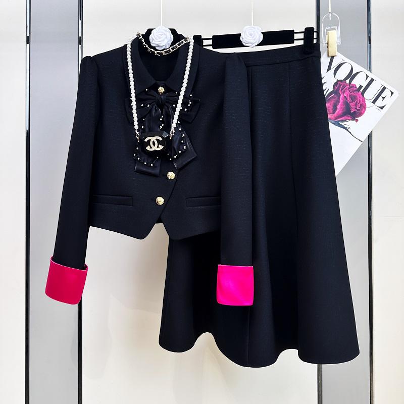 핫핑크 배색 여성 정장세트 리본 금장단추 카라넥 퍼프 자켓 플레어스커트 투피스 면접복장