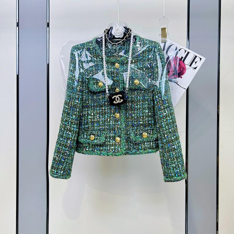 그린 트위드 노카라 자켓 금장단추 명품스타일 엄마옷선물 하객룩 청바지코디
