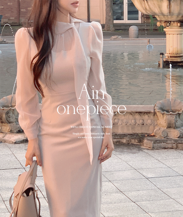 아인 쉬폰 리본 타이 H라인 퍼프 롱 원피스 하객룩 졸업식