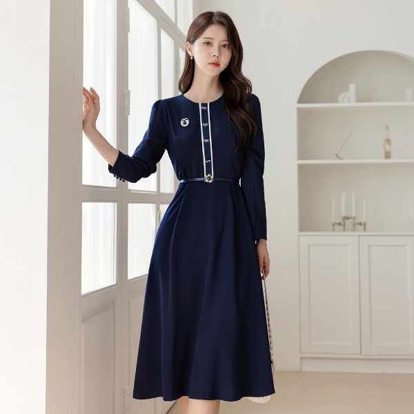 피레타드 플라켓 디테일 리본 버튼 실버 벨트 셋트 플레어 원피스