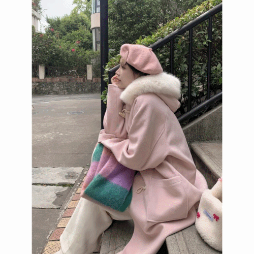 [겨울신상/가을자켓]털후드 핑크 떡볶이코트 귀여운 오버핏 모직코트 딸기우유색 데일리 오피스 출근룩 학생 교복코디 떡코 후드자켓 키작녀