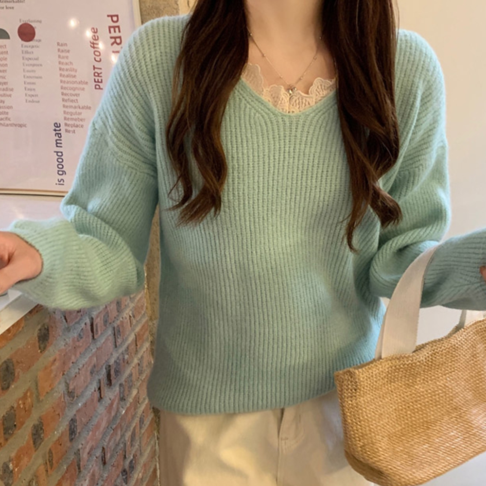 브이넥 긴팔 니트 가을 소라색 레이스 하찌 빨간 배색