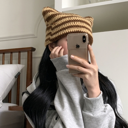 [무배] 키튼 고양이귀 스트라이프 패션 모자 y2k 키치 니트 비니 3color
