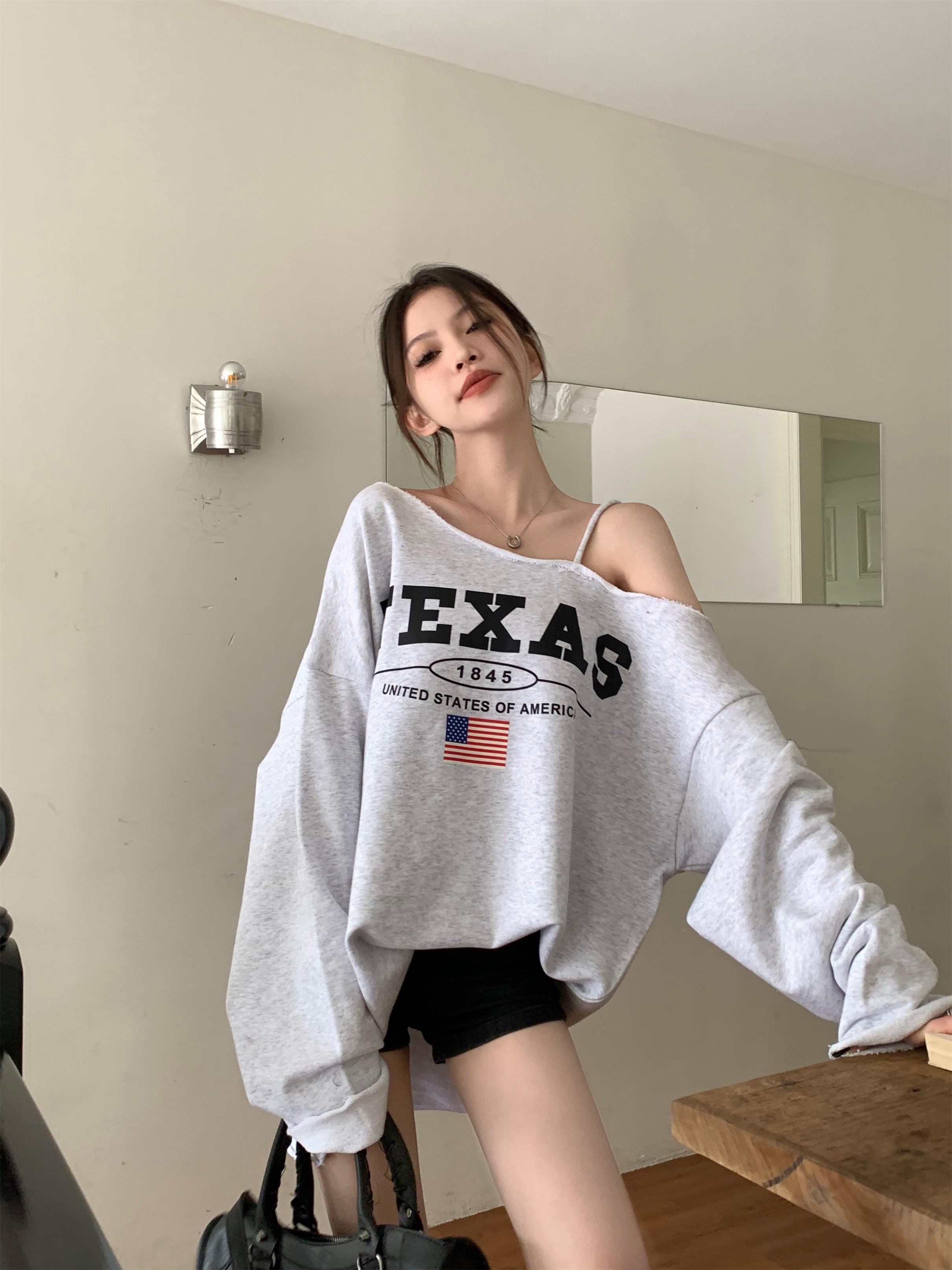 오프숄더 프린팅 오버핏 롱 맨투맨 티셔츠 러블리 캐주얼 학생룩 캠퍼스룩 여친룩 데이트룩 힙한 MZ 유니크한 스트릿 홍대룩 가을 데일리룩