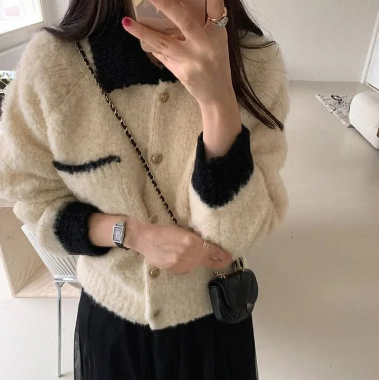 (당일출고/하객룩추천) 카라 배색 루즈핏 오버핏 부클 앙고라 연말룩 파티룩 하객룩 트위드 니트 스웨터 가디건 아우터 자켓 2color