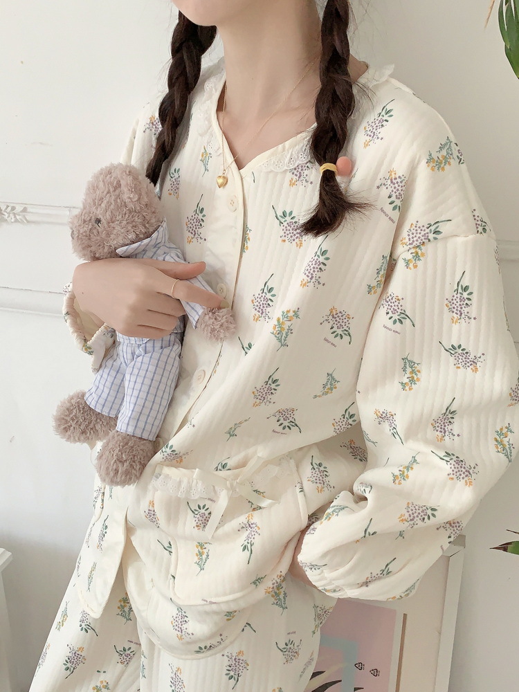 노카라 라벤더 누빔 잠옷 겨울 긴팔 순면 빅사이즈 수면 우정 커플 파자마 투피스 실내복