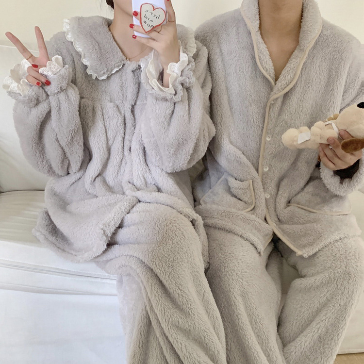 그레이 레이스 극세사 커플 수면 잠옷 겨울 긴팔 공주 여성 남성 빅사이즈 기모 파자마