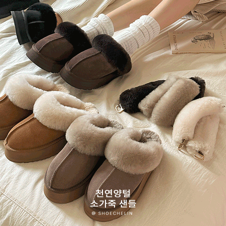 [나노발수코팅] 플랫폼 퍼스트랩 천연소가죽 양털슬리퍼 (4.5cm) #털샌들 #통굽뮬