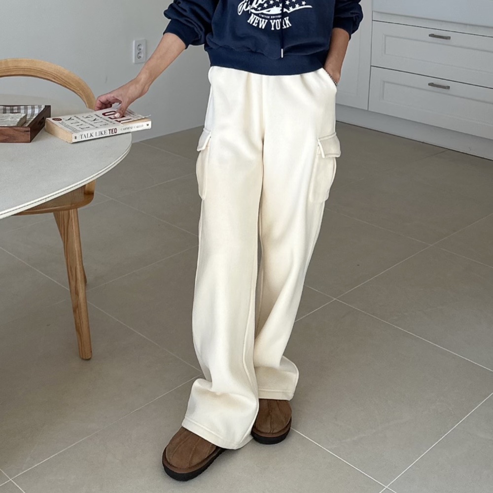 기모 흰바지 카고팬츠 코튼 면 와이드 밴딩 일자 겨울 여자 바지 팬츠