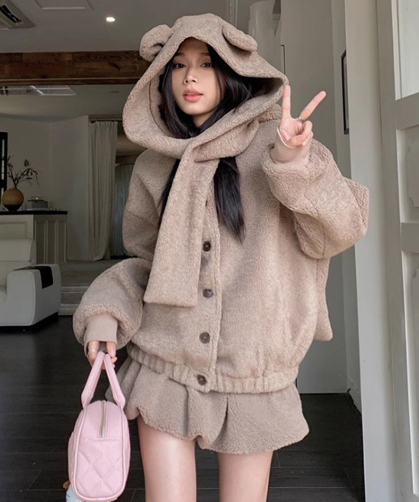 무료배송 [코디세트 모자+탑+스커트] 곰돌이후드 목도리 투피스셋업 #겨울코디 #셋업