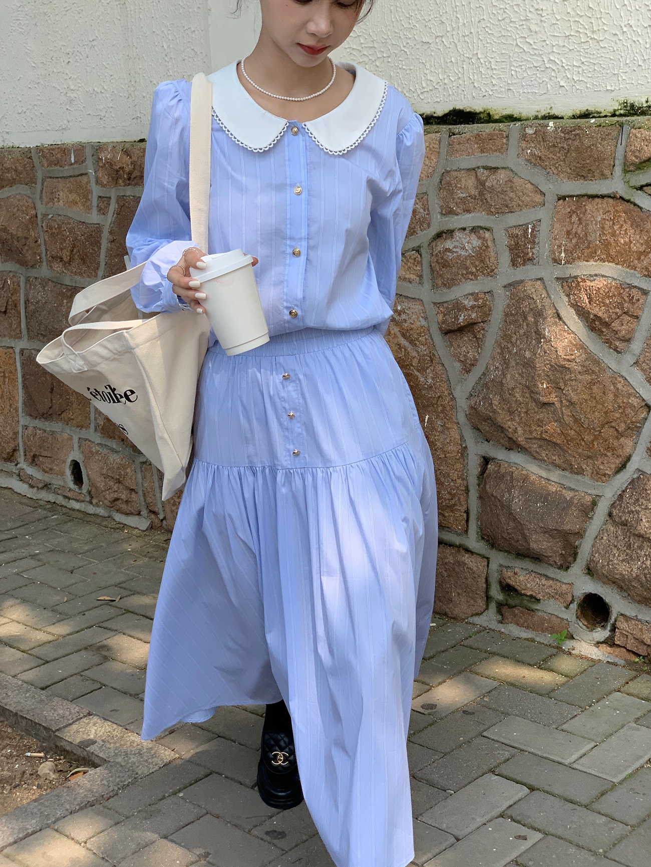 SET 가을 블루 스트라이프 둥근카라 셔츠 + 캉캉 롱 치마
