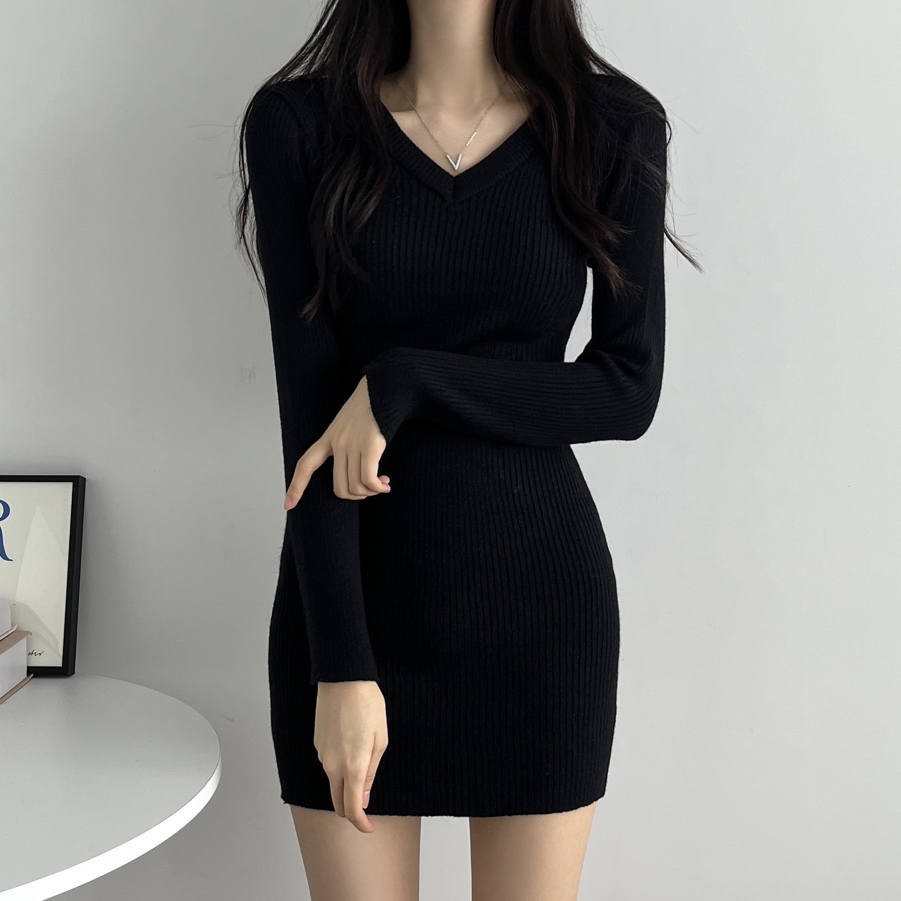 💗당일출고💗 [3color] 브이넥 골지 니트 미니 원피스