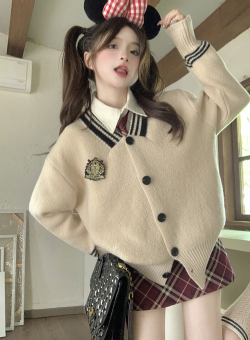 귀여운 프레피룩 학교 느낌 배색 예쁜 단추 도톰한 따뜻한 옷 아메카지 루즈핏 스웨터 자켓 대학생 여성 20대 30대 니트