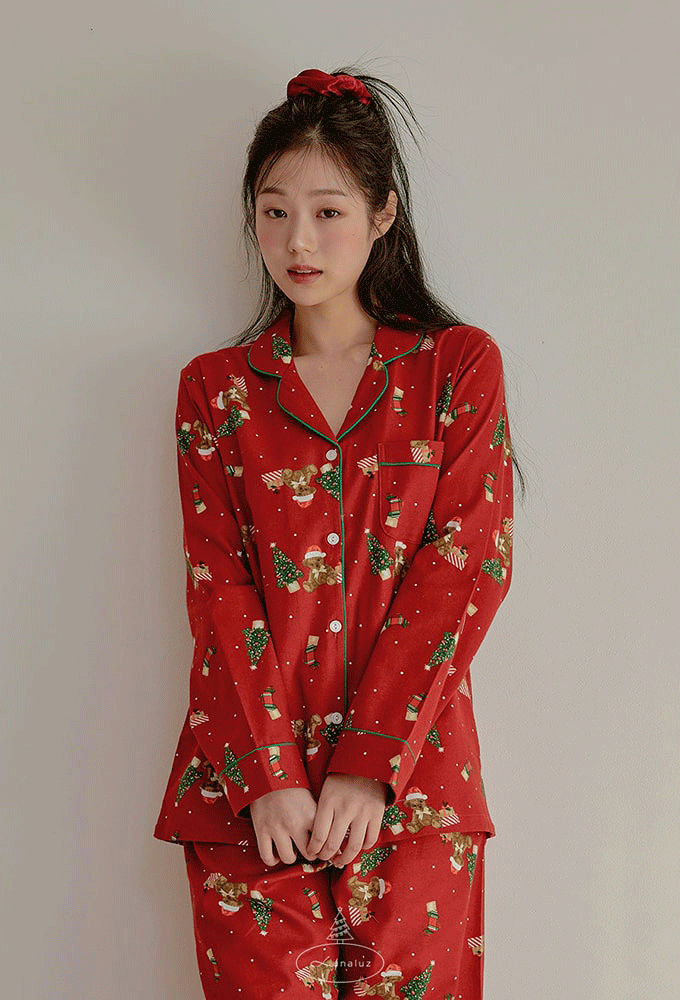 여성-산타베어 기모면 카라형 긴팔상하잠옷 홈웨어