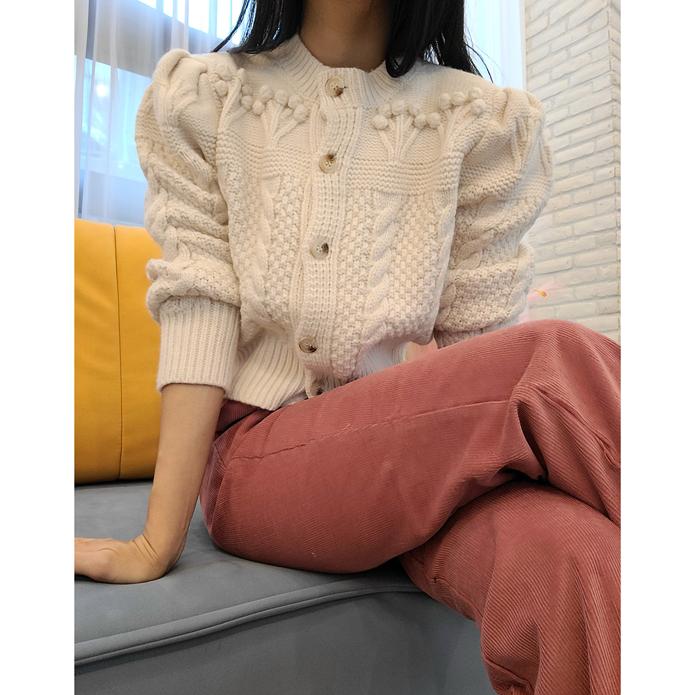 마리 퍼프 소매 도톰한 뜨개 숏 가디건