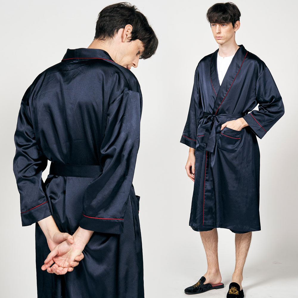 남자가운 무지로브 실크 샤워가운 나이트가운 잠옷로브 [~120cm롱기장] (네이비)