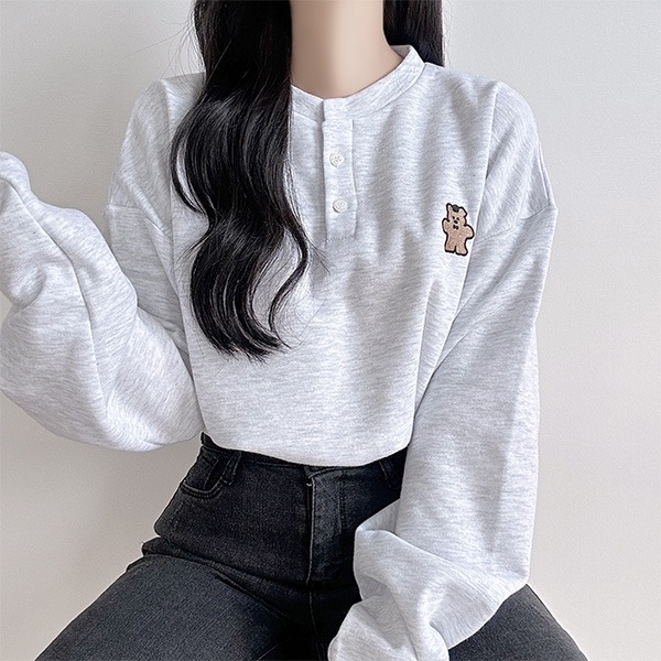 [기모] 난타, 베어 자수 버튼 오버핏 맨투맨