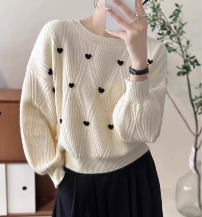 [2컬러] 하트패치 다이아 니트 여성 라운드 스웨터 여성스러운 니트 짜임 베이직 심플 데일리 봄 가을 겨울 코디 하객룩