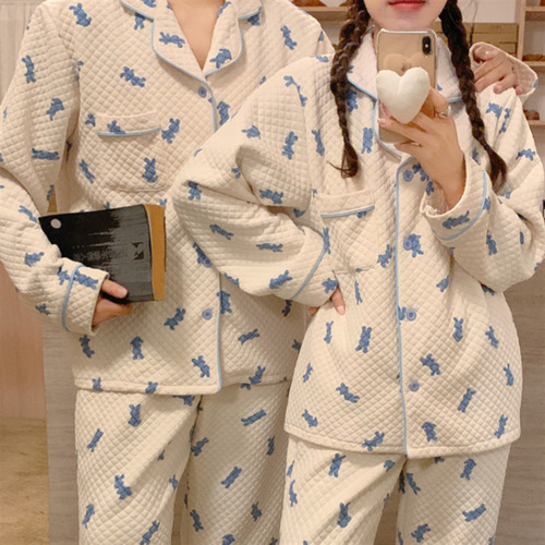 블루토끼 순면 누빔 커플 잠옷 겨울 긴팔 빅사이즈 수면 동물 기모 남자 파자마 투피스