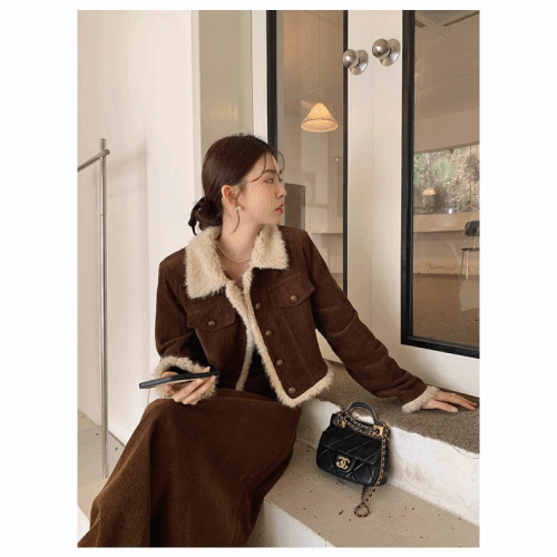 [겨울신상/하객룩투피스]브라운 스웨이드 숏자켓 핀턱 롱스커트 셋업 코디 퀼팅 모직 털 안감 A라인 골덴 도톰 따듯 데일리 출근룩 결혼식 돌잔치 데이트