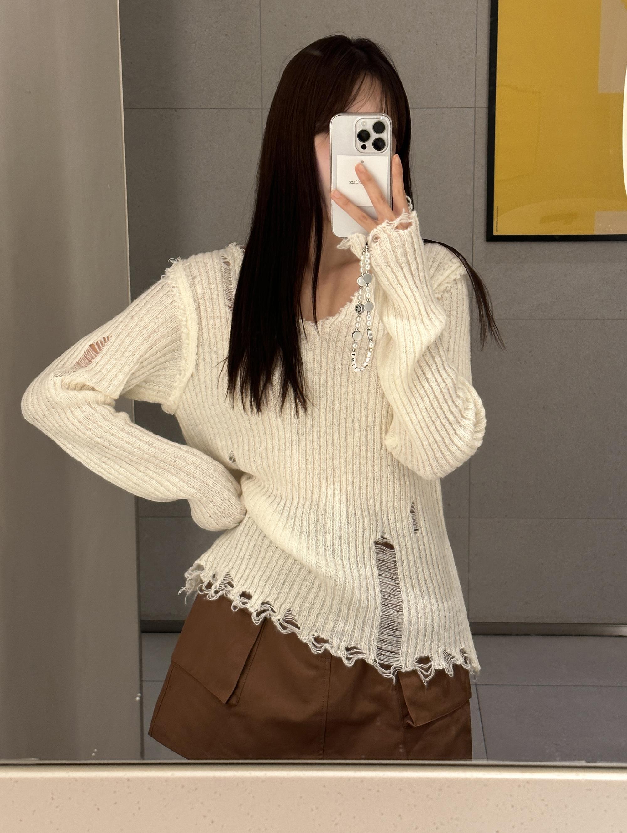 여성 빈티지 브이넥 그물 울니트 루즈핏 구멍 골지 니트