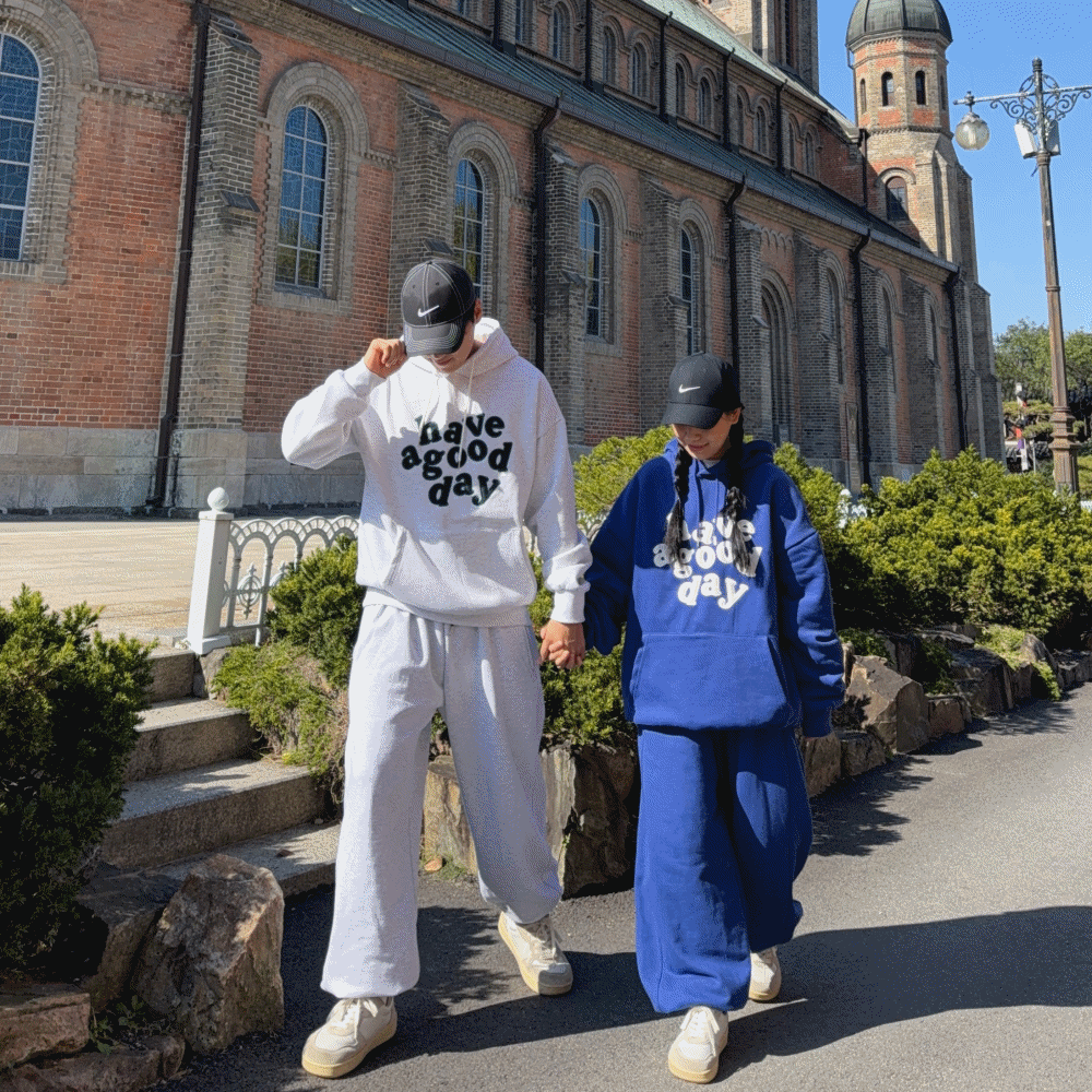 [모델소장,주문폭주🚀] 남녀공용 기모 해브어굿데이 오버핏 후드티 벌룬 와이드 팬츠 셋업 커플 시밀러룩
