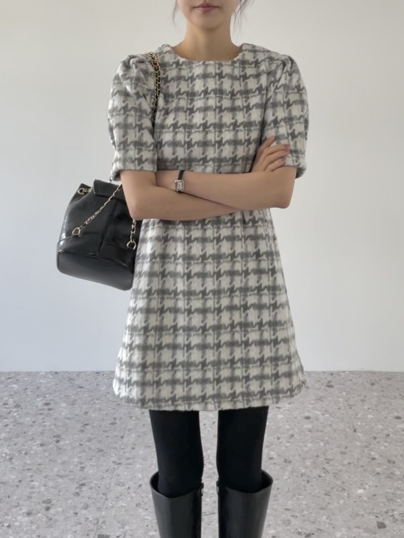 하운드 체크 미니 원피스 파티룩 겨울 하객 연말룩