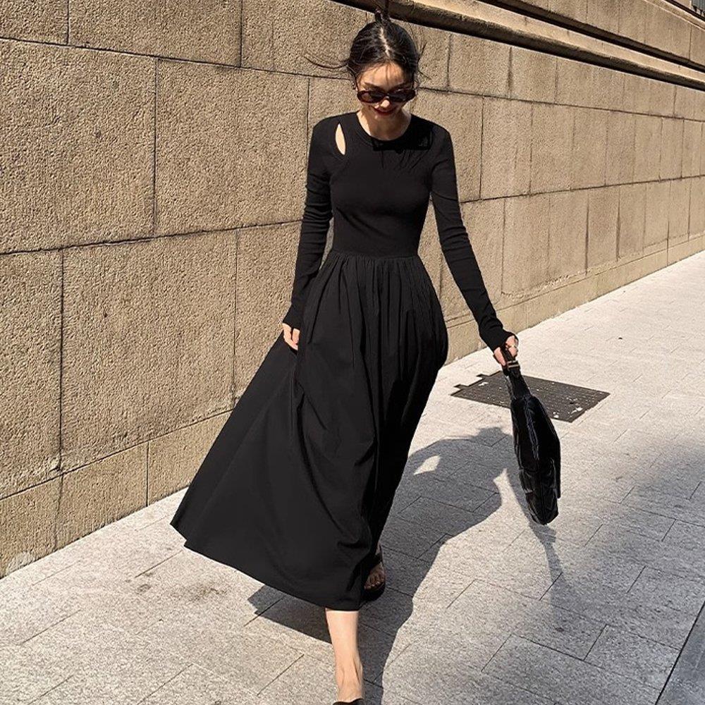 여자 스테디 시크룩 올블랙 A라인 스판 펀칭 원피스