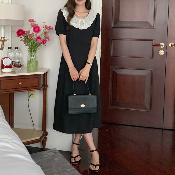 (당일출고)배색 레이스 카라 퍼프 숄더 롱원피스 1128-lz1a