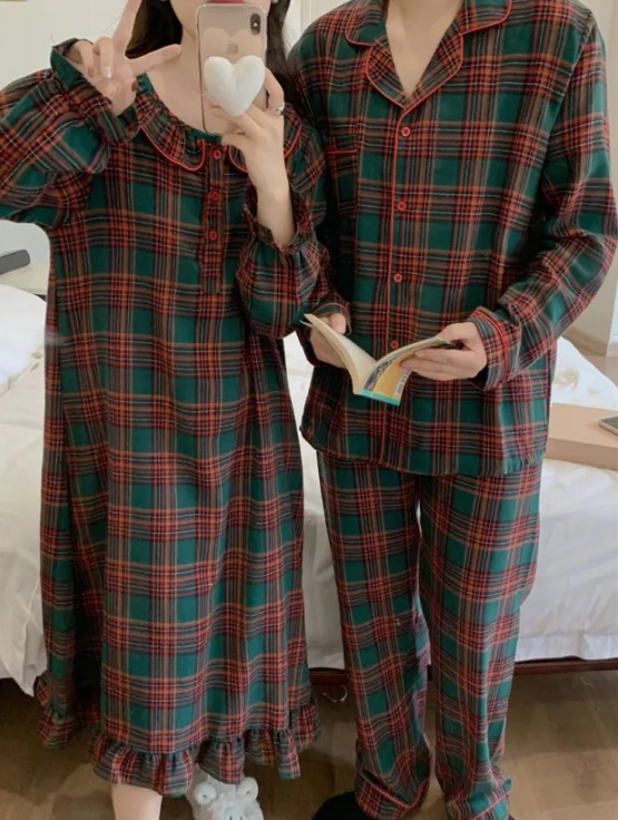 신상 긴 커플케인세트 파자마 잠옷 (데일리 홈웨어 크리스마스 원피스 체크)