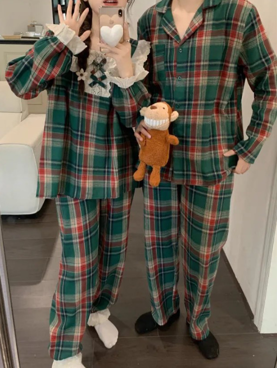 긴팔 커플트리 파자마 잠옷세트 (데일리 홈웨어 체크 크리스마스) - 남자, 여자