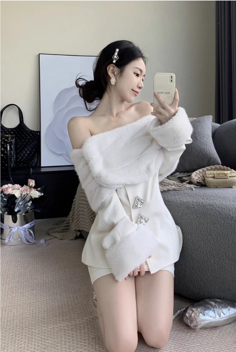 라이트 럭셔리 하이 엔드 연예인 Xiaoxiang 스타일 원 숄더 모조 모피 재킷과 스커트 투피스 세트