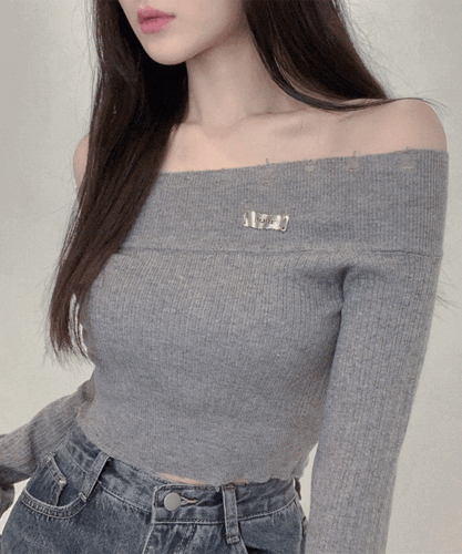550 패치 골지 오프숄더 크롭 숏 빈티지 니트 티셔츠