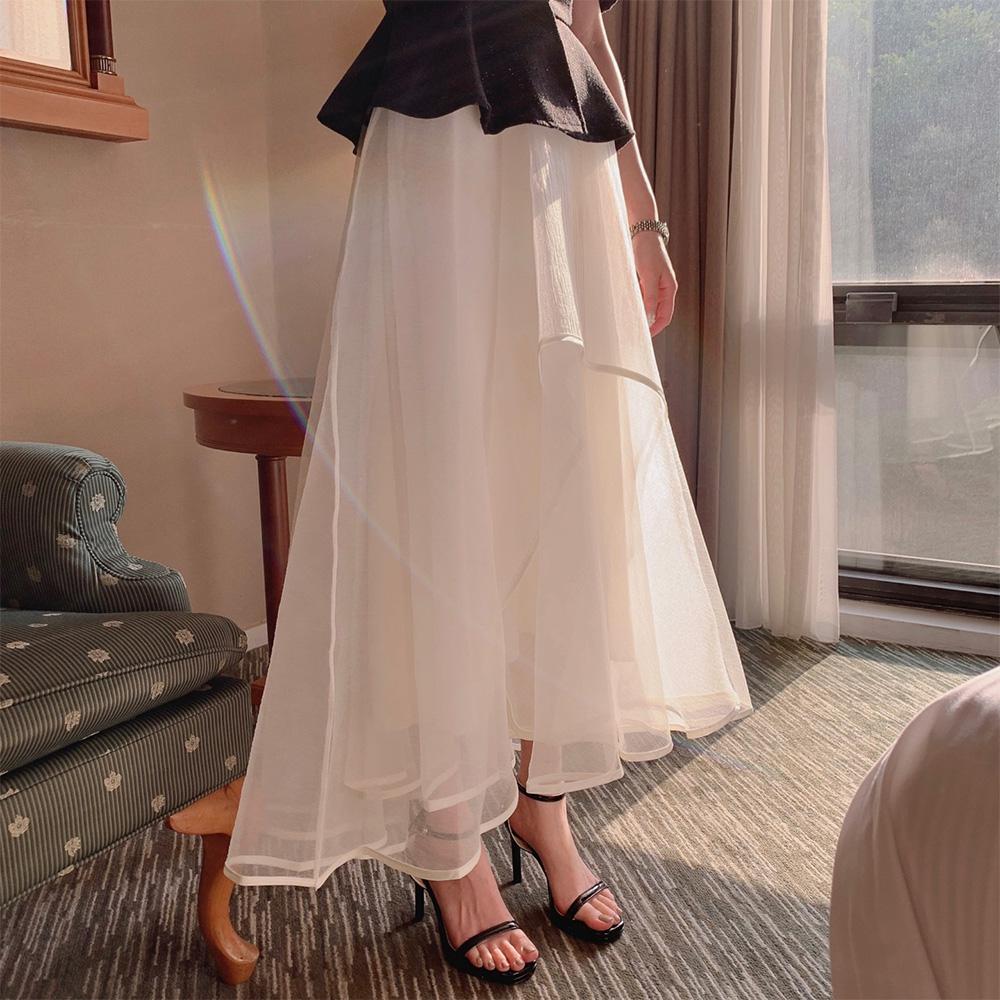 [델리썸] premium 세이지 오간자 시스루 언발 프릴 밴딩 롱 스커트 2COL