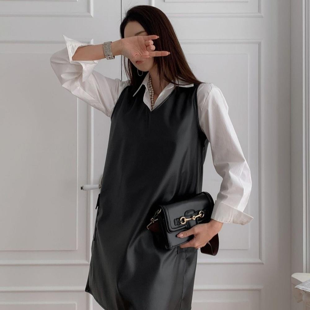 여자 캐주얼 레자 브이넥 레이어드 카고 가죽 원피스