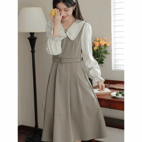 [겨울신상/하객원피스]애쉬그레이 리본 빅카라 정장 미디원피스 잘록허리 벨트세트 핀턱 A라인 퍼프 블라우스 롱원피스 나팔소매 빅사이즈 결혼식 하객룩 데이트룩 돌잔치 미팅 소개팅 연말