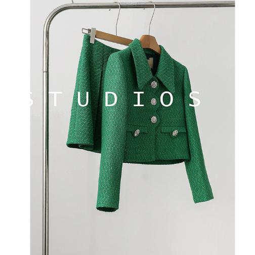 트위드 투피스 물결 초록색 크롭 자켓 셋업 플리츠스커트 큐빅단추 여성 정장세트 예복