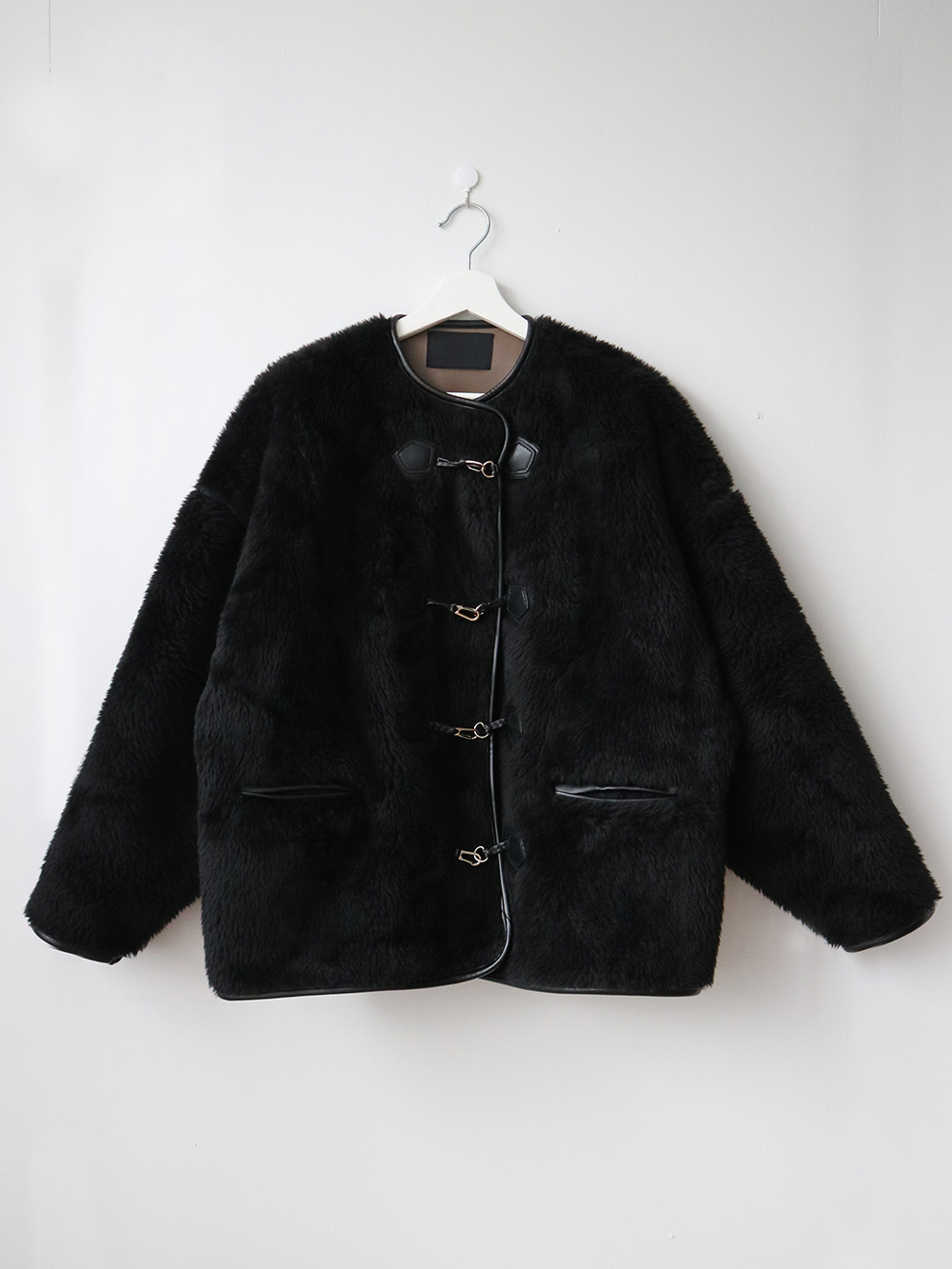 버클 노카라 무스탕 블랙 숏 퍼 코트