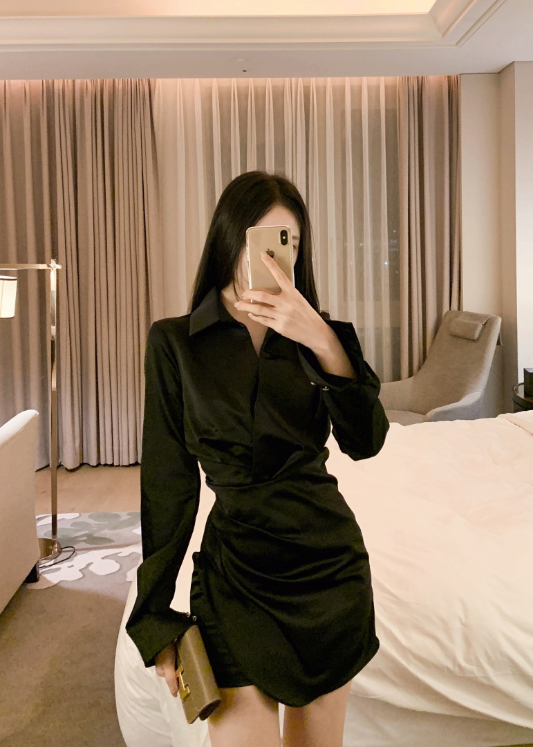 [highquality] *여친룩* 클래식 명품 이중 새틴 셔츠 드레이프 원피스 블랙