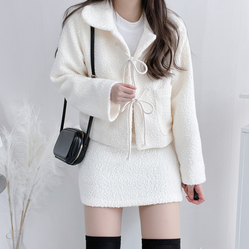 [셋업set/국내고퀄/양털] 세미 A라인 카라 리본 뽀글이 양털 리본 코트 투피스 세트