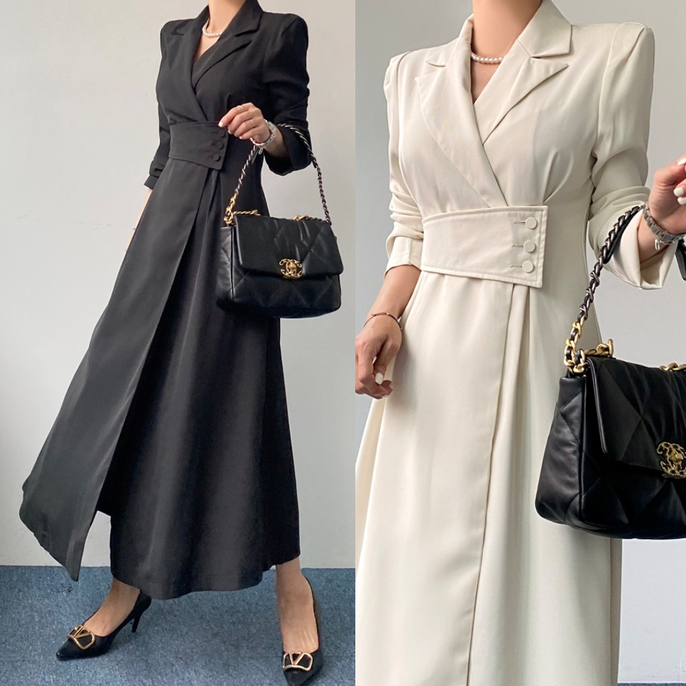 은플 깔끔한 모던 카라 브이넥 롱원피스 봄가을 고급 하객원피스 정장원피스 격식룩