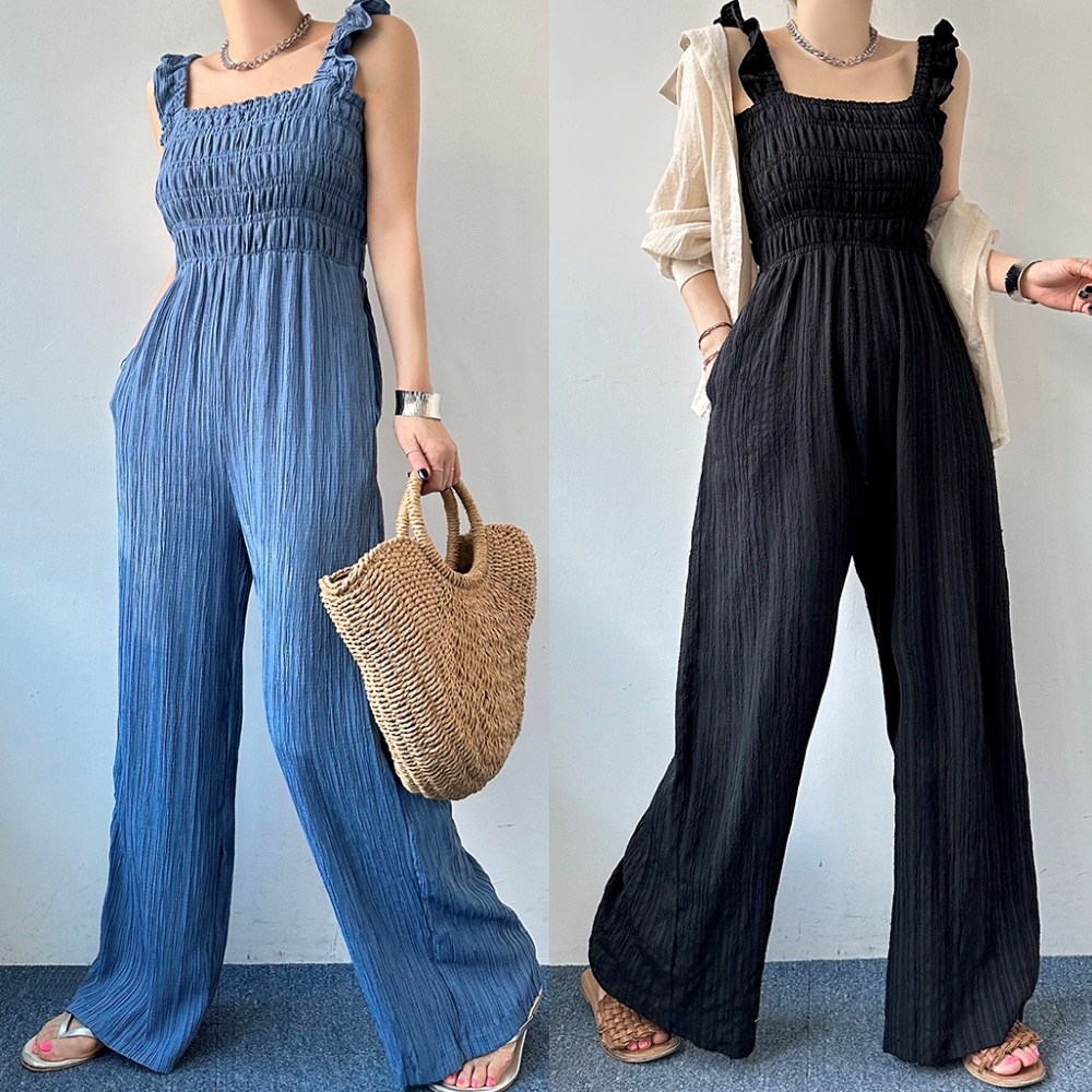 은플 러블리 프릴 와이드 멜빵바지 스모크 밴딩 나시 점프수트