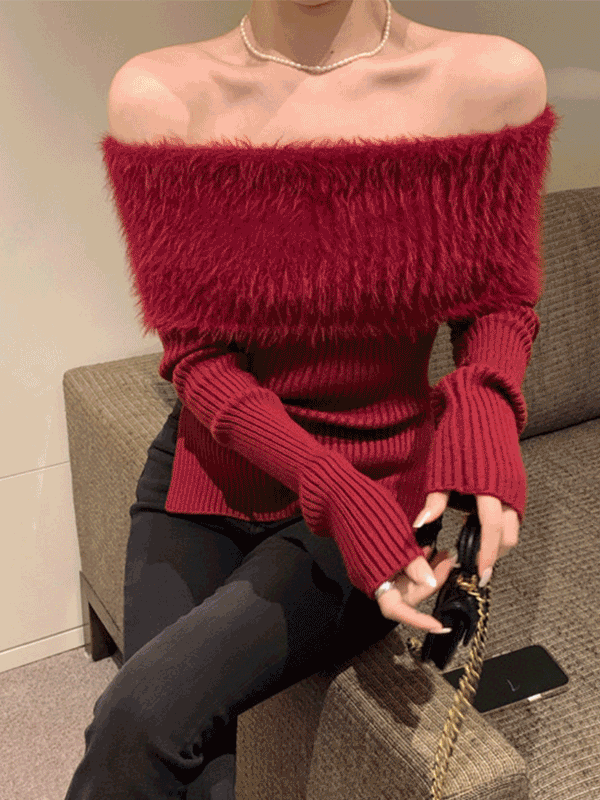 [오트밀/블랙 당일출고🚚][페미닌/연말룩🌹]시크릿 슬림핏 퍼 오프숄더 골지 니트 티셔츠