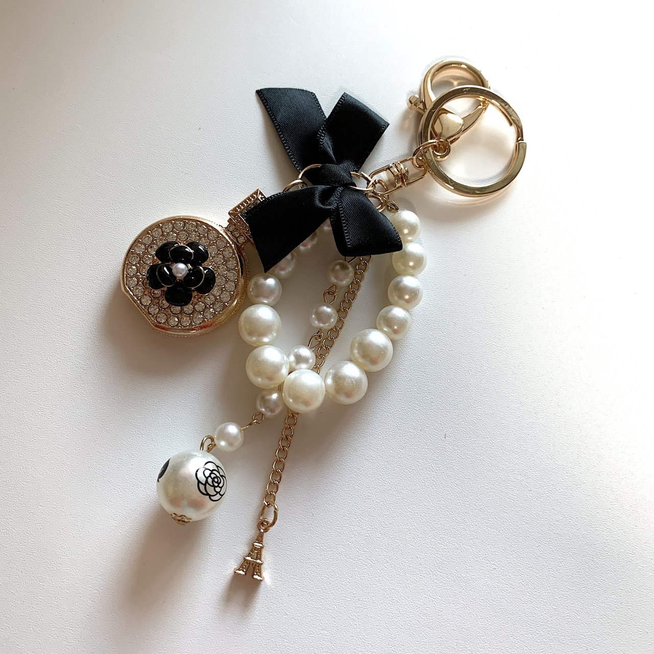 향수병 큐빅 키링 열쇠고리 검정색 리본 블랙 장미 꽃 퍼퓸 블링블링 가방 장식