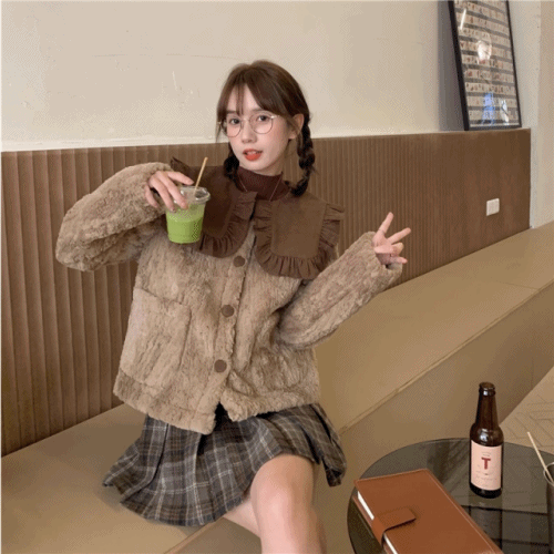 [겨울신상/겨울하객룩/연말룩]빅카라 프릴레이스 털자켓 브라운 베이지 숏코트 귀여운 겨울코트 도톰 플러시 코트 퍼자켓 데이트룩 결혼식 하객코디 돌잔피 여친룩 데이트룩 크리스마스