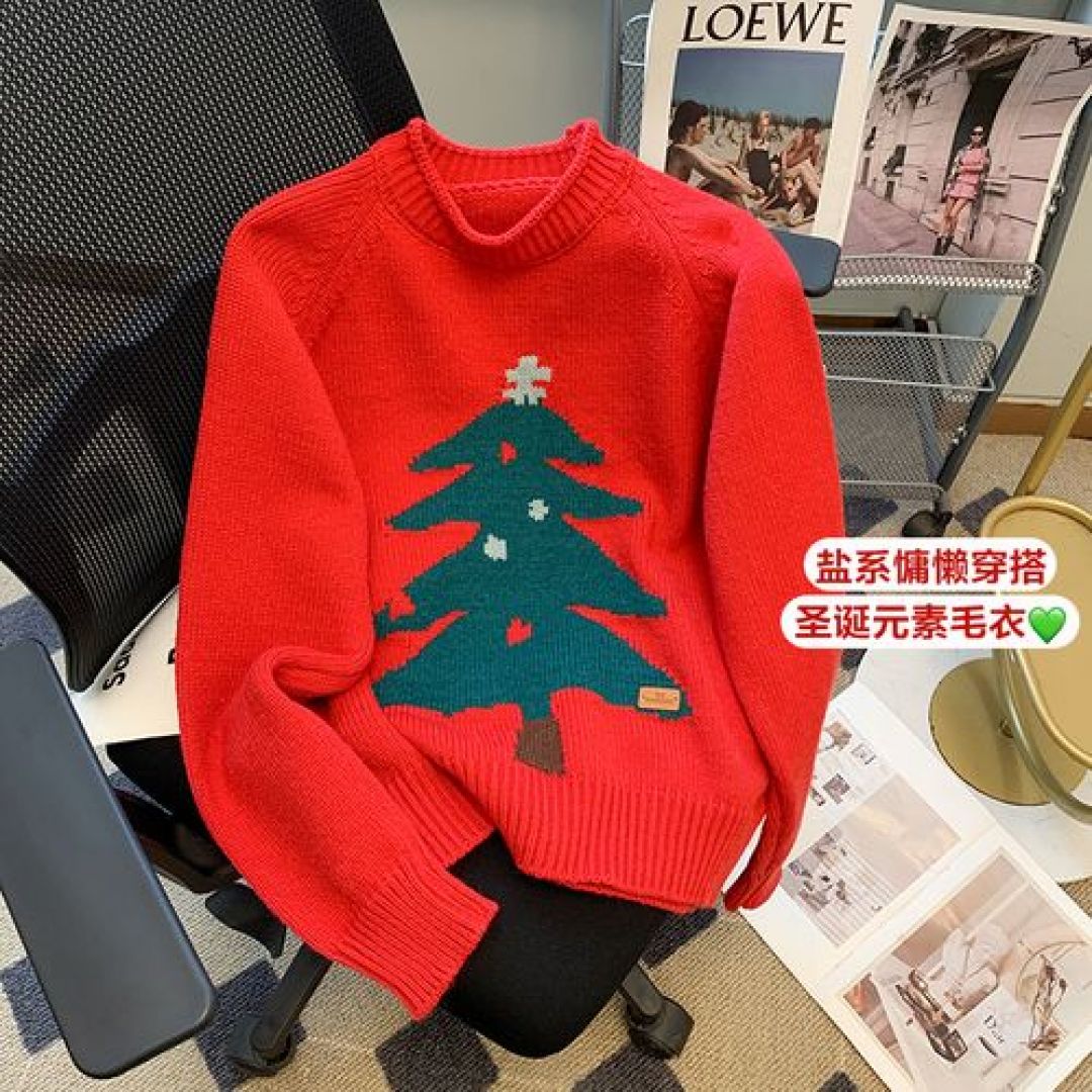여성 빨간 레트 트리 프린트 나그랑 맨투맨 반목 니트 스웨터 크리스마스룩 아이보리