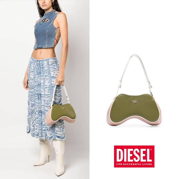 DIESEL 디젤 밀리터리 그린 비대칭 플레이숄더 - 투톤 디자인의 숄더백