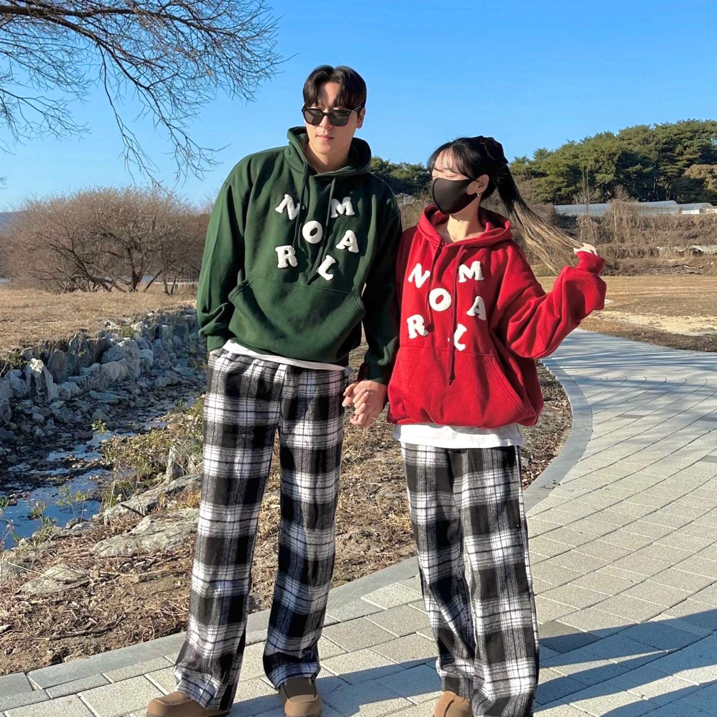 세트가능/기모 크리스마스 커플룩 커플 후드티 밴딩 체크 와이드팬츠 노멀 연말룩 시밀러룩 남녀공용 오버핏 맨투맨 레드 그린 봄 가을 겨울 데이트룩 데일리 꾸안꾸 커플 잠옷 파자마