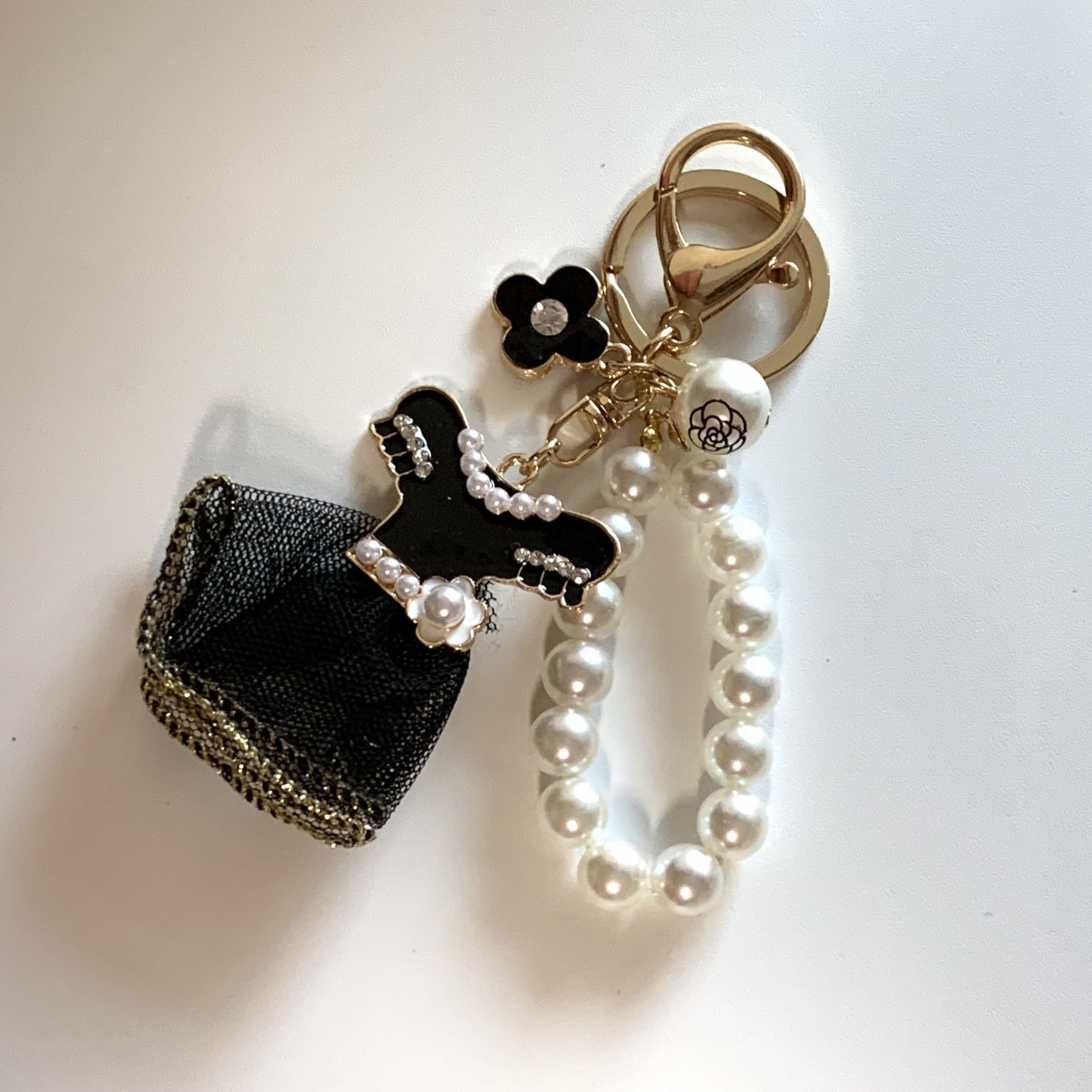 가방키링★블랙드레스 진주 장미 데이지 꽃 볼 원형 옷 검정 원피스 열쇠고리 가방장식